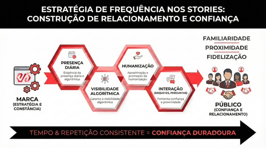 Plataformas como o Instagram priorizam perfis ativos e consistentes. A publicação frequente nos Stories sinaliza ao algoritmo que o perfil está em movimento, o que contribui para maior visibilidade orgânica e recorrência de exibição.