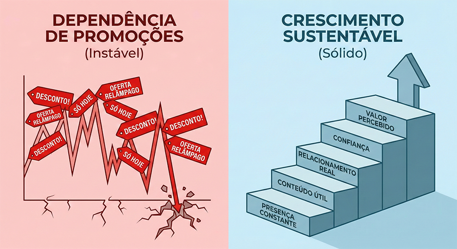 Crescer sem depender de promoções recorrentes exige uma mudança clara de mentalidade. Em vez de competir por preço, empresas que buscam crescimento sustentável passam a investir em valor percebido, relacionamento e presença consistente ao longo do tempo.