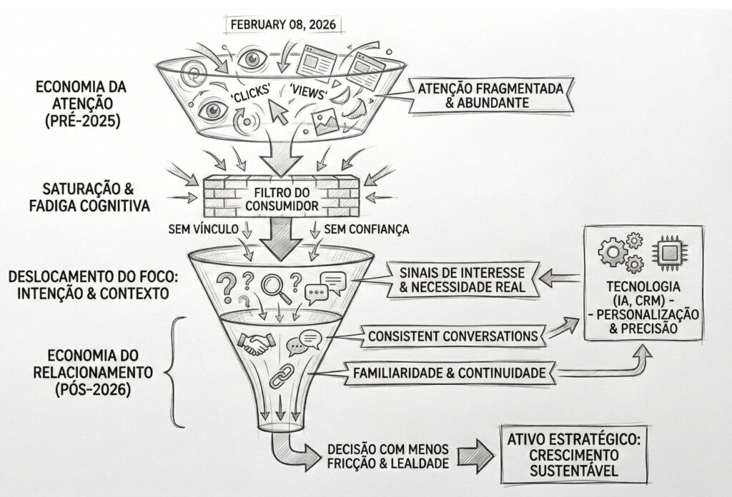 Durante anos, o marketing digital foi orientado por uma lógica simples: vencer quem conseguisse capturar mais atenção. Cliques, visualizações, impressões e alcance tornaram-se os principais indicadores de sucesso. No entanto, entre 2025 e 2026, esse modelo começou a mostrar sinais claros de esgotamento. A atenção não desapareceu, mas deixou de ser um ativo escasso. Tornou-se abundante, fragmentada e cada vez menos valiosa quando isolada de contexto, relevância e intenção real.