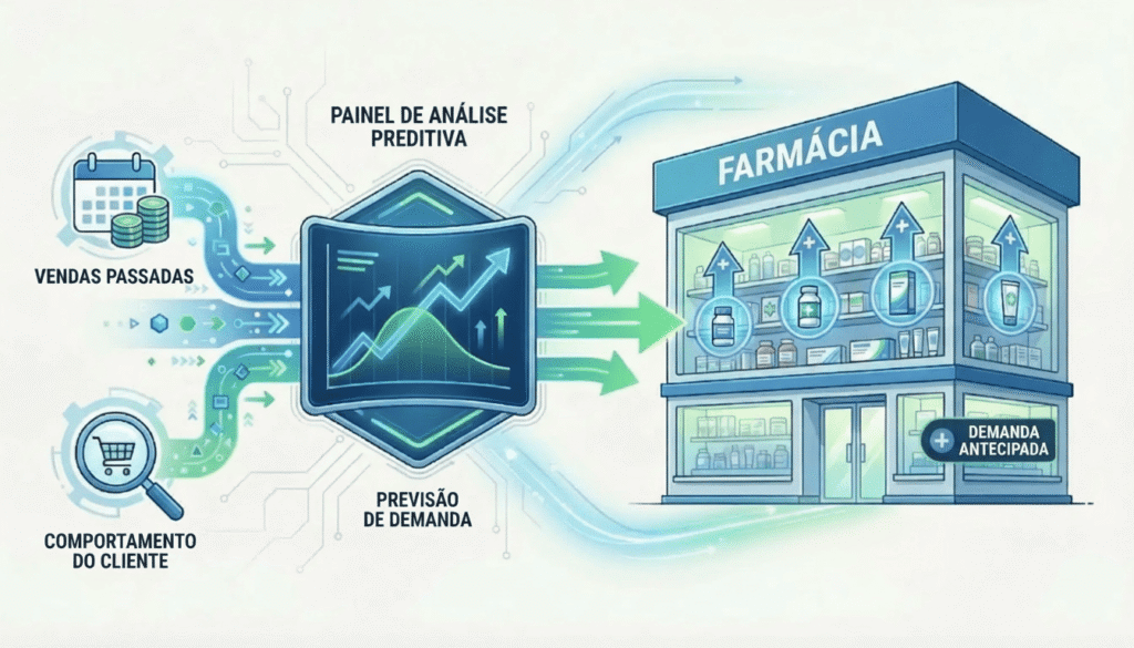 Essas análises permitem que a farmácia antecipe tendências de demanda em vez de reagir apenas quando o estoque já está comprometido.