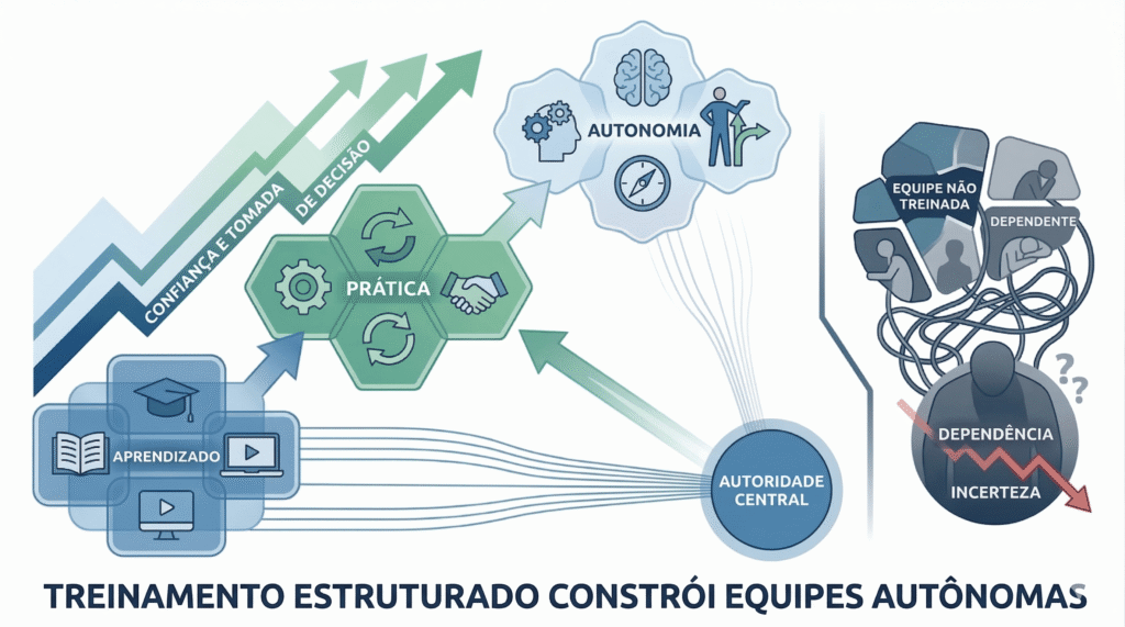 Documentar processos e definir critérios de decisão são condições necessárias para a autonomia da equipe. Mas não são suficientes. Uma equipe que tem acesso ao manual mas nunca foi treinada a partir dele não vai consultá-lo quando precisar. Vai improvisar, que é exatamente o comportamento que o gestor quer eliminar.
