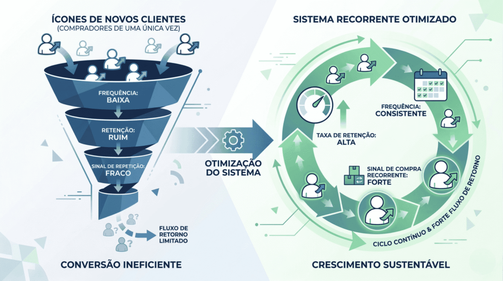 • Proporção de faturamento de clientes recorrentes versus compradores novos: se mais de 50% do faturamento vem de clientes que estão comprando pela primeira vez, a base recorrente é frágil e o crescimento depende de aquisição constante. O objetivo é inverter progressivamente essa proporção até que a maioria do faturamento venha de uma base que retorna de forma autônoma.