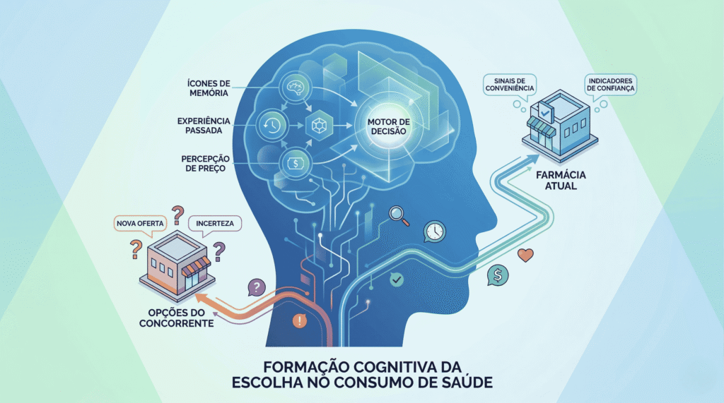 Quando surge a próxima necessidade, o cliente não faz uma análise racional de todas as farmácias que conhece. Ele vai para a opção mais disponível mentalmente, que é a farmácia que está mais presente na sua memória naquele momento. Se a farmácia onde ele comprou na semana passada não fez nada para manter essa presença, ela compete em igualdade com todas as outras opções que o cliente conhece, incluindo a que fica no caminho do seu trabalho e a que apareceu primeiro no Google quando ele buscou o produto.