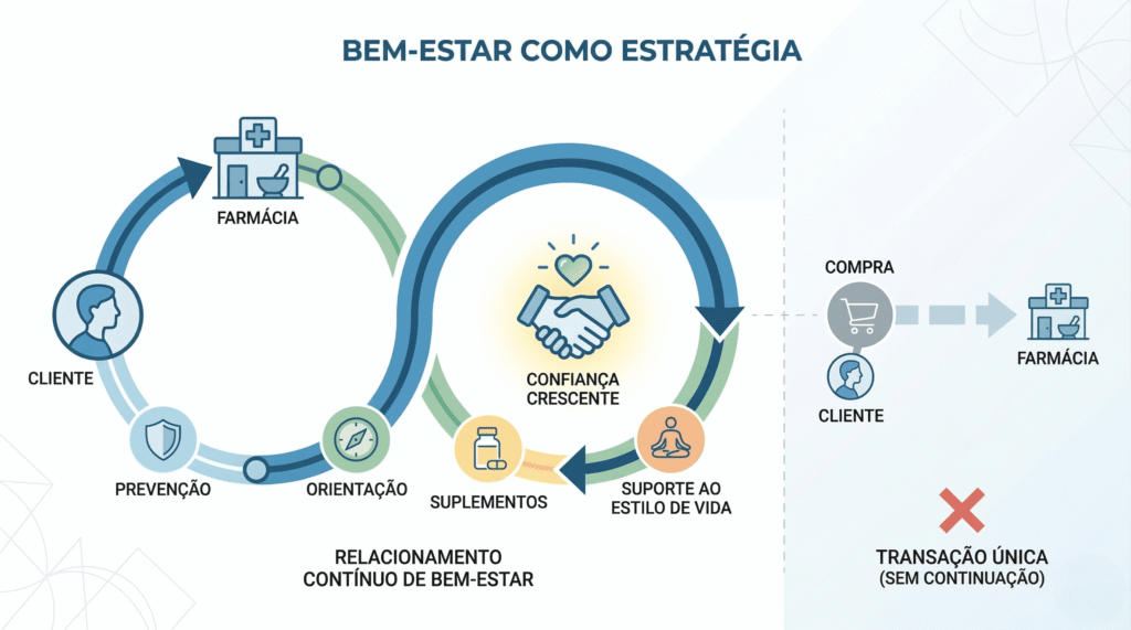 A lógica de fidelização do cliente de wellness é diferente da do cliente de medicamento. O cliente de medicamento volta porque precisa. O cliente de wellness volta porque confia. E confiança é construída por orientação qualificada, por consistência de mix e por uma experiência de compra que vai além da transação.