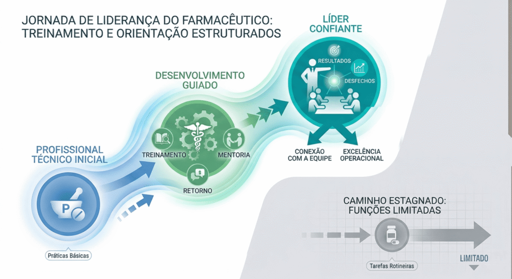 O cargo de farmacêutico não confere liderança. O diploma tampouco. Liderança no varejo de saúde é um conjunto específico de competências que a graduação em farmácia raramente desenvolve de forma estruturada, porque a graduação foi desenhada para formar um profissional clínico e regulatório, não um gestor de operação comercial.