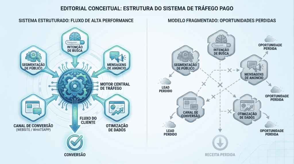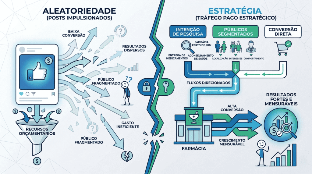 Tráfego pago estratégico é a prática de exibir anúncios pagos para pessoas com intenção de compra ativa, no canal correto, no momento correto e dentro do raio geográfico da operação. Difere do impulsionamento de post porque não amplia o alcance de um conteúdo para qualquer pessoa: direciona a mensagem para quem já está buscando o produto ou serviço.