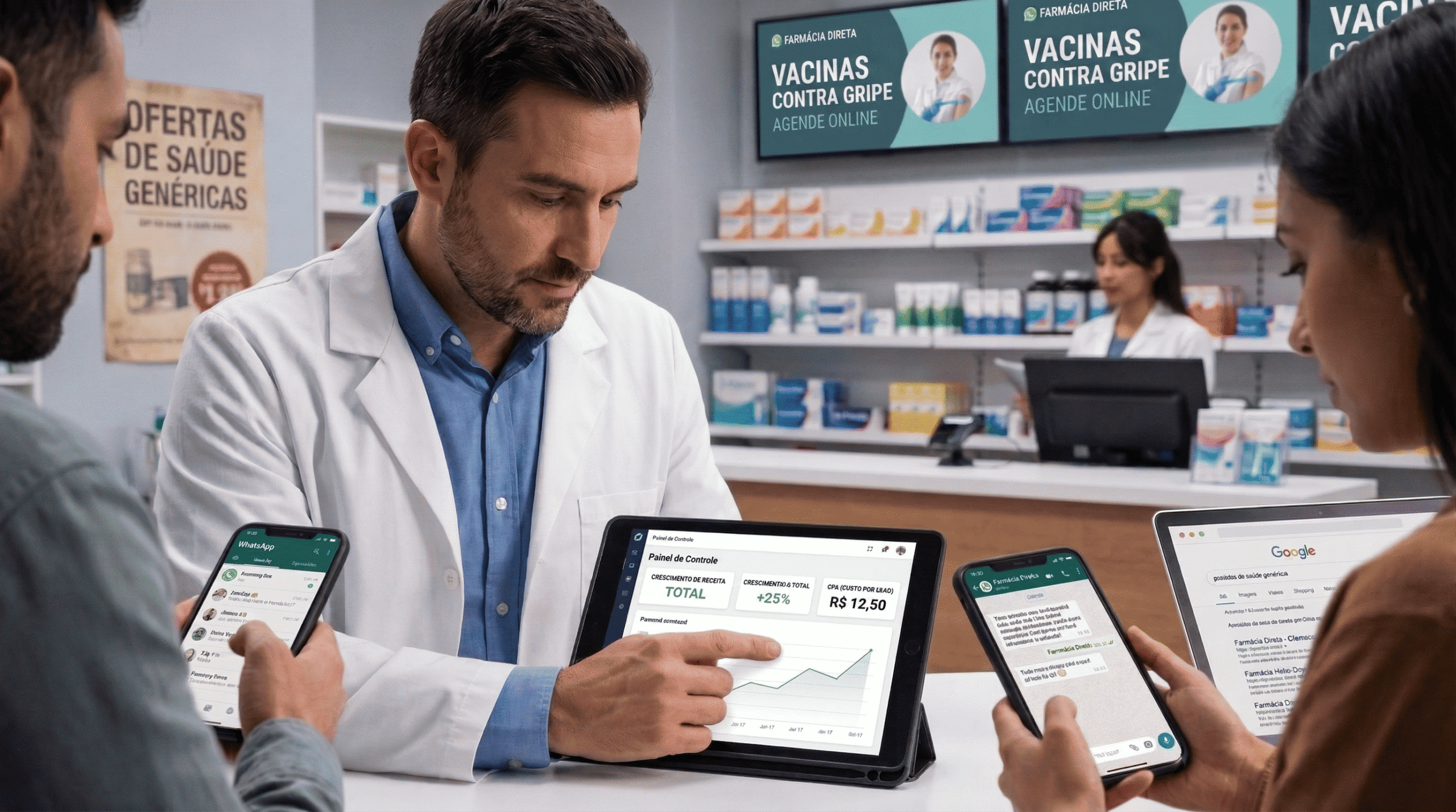 O problema não foi o canal. Foi a ausência de estrutura. Tráfego pago no varejo de saúde tem peculiaridades que uma agência generalista não domina: restrições de publicidade da Anvisa e das próprias plataformas para termos de saúde, comportamento de busca específico do paciente, palavras-chave de alta intenção que diferem das de outros setores, e configurações de segmentação local que exigem experiência no setor para serem calibradas corretamente.